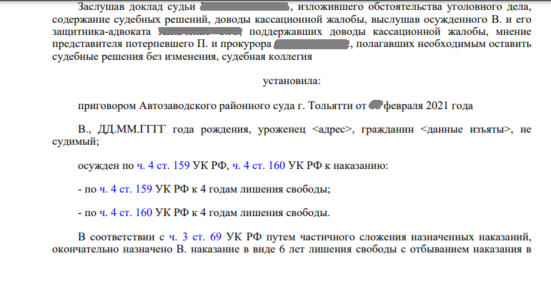 Осужден по ч. 4 ст. 159 УК РФ, ч. 4 ст. 160 УК РФ к наказанию: - по ч. 4 ст. 159 УК РФ к 4 годам лишения свободы; - по ч. 4 ст. 160 УК РФ к 4 годам лишения свободы. В соответствии с ч. 3 ст. 69 УК РФ путем частичного сложения назначенных наказаний, окончательно назначено В. наказание в виде 6 лет лишения свободы. приговор Автозаводского районного суда г. Тольятти Самарской области от 08 февраля 2021 года и апелляционное определение судебной коллегии по уголовным делам Самарского областного суда от 19 июля 2021 года в отношении В. в части осуждения за совершение преступления, предусмотренного ч. 4 ст. 160 УК РФ, отменить и прекратить уголовное дело в этой части на основании п. 2 ч. 1 ст. 24 УПК РФ. Приговор от февраля 2021 года и апелляционное определение судебной коллегии по уголовным делам Самарского областного суда от июля 2021 года в отношении В. в части осуждения за совершение преступления, предусмотренного ч. 4 ст. 160 УК РФ, отменить и прекратить уголовное дело в этой части на основании п. 2 ч. 1 ст. 24 УПК РФ. Приговор районного суда от февраля 2021 года и апелляционное определение судебной коллегии по уголовным делам Самарского областного суда от июля 2021 года в отношении В. изменить: исключить указание о назначении В. окончательного наказания в соответствии с ч. 3 ст. 69 УК РФ; считать В. осужденным по ч. 4 ст. 159 УК РФ к