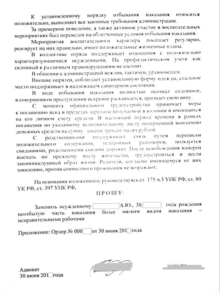 После подготовки адвокатом всех документов менее через два месяца мне удалось убедить суд и заменить неотбытую часть наказание более мягким видом наказания - исправительными работами.